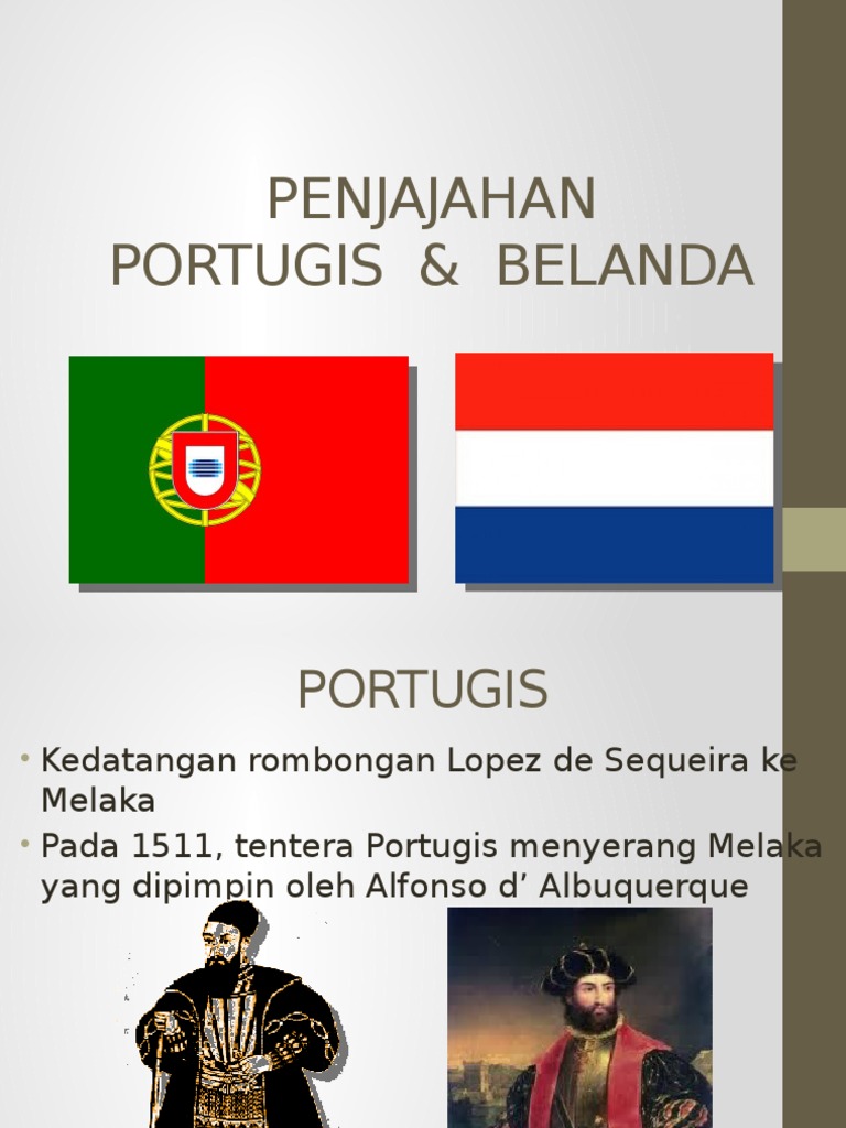 Powerpoint presentation penjajahan portugis & belanda portugis kedatangan rombongan lopez de sequeira ke melaka pada 1511, tentera portugis menyerang melaka yang dipimpin… text of penjajahan portugis dan british.