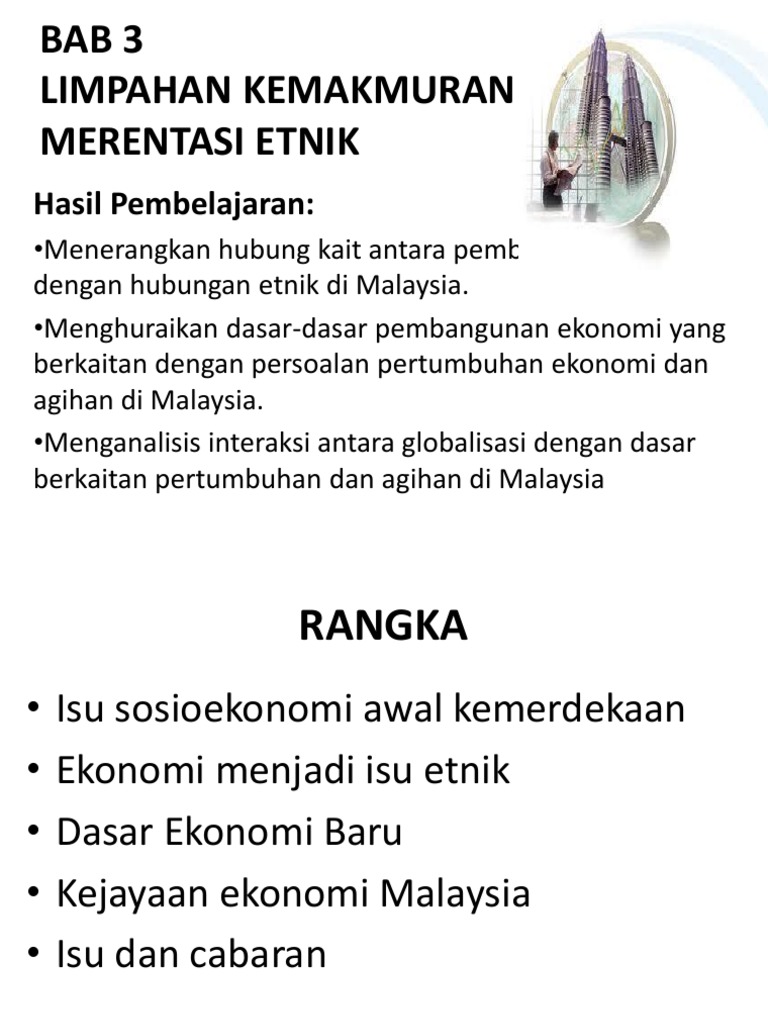 Bab 3 Pelajar from imgv2-2-f.scribdassets.com Ekonomi menjadi isu etnik pptx ekonomi menjadi isu etnik ctu 553 u2022 isu kemiskinan menjadi persoalan utama pada tahun 1970 an terutamanya dalam course hero Pada 1970, hampir 2/3 guna tenaga dalam sektor pertama (pertanian dan perikanan) terdiri dari etnik melayu. Bab 3 limpahan kemakmuran merentasi etnik. Sehubungan dengan itu, pihak kerajaan telah berupaya menjalankan dasar yang mengutamakan keseimbangan kepentingan setiap etnik yang ada di malaysia. Perkara ini yang menjadi isu dalam konteks pertumbuhan ekonomi dan agihan ekonomi berdasarkan etnik. 17 kamaruzaman bin ujang (1990) dalam 'the malaysian chinese dilemma'. Ekonomi menjadi isu etnik pptx ekonomi menjadi isu etnik ctu 553 u2022 isu kemiskinan menjadi persoalan utama pada tahun 1970 an terutamanya dalam course hero. Inilah yang seterusnya menjadi isu dalam pembangunan ekonomi dan agihan ekonomi negara.